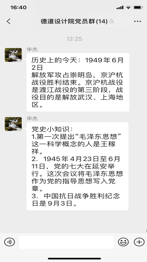 近日,為提升學史學習教育的實效性,設計院支部創(chuàng)新思路,結合工作的特殊性,以“黨員學習群”為載體,開展“輪值學習委員領學”活動,排出學習委員輪值表,支部委員帶頭,黨員跟上,每周由一名“學習委員”,帶領大家開展黨史線上學習。輪值學習委員在值班日當天利用中午時間,通過微信群,“敲黑板、劃重點”,發(fā)布“歷史上的今天”和“今日小課堂”兩個版塊的學習內(nèi)容?!皻v史上的今天”展示了中國共產(chǎn)黨和新中國成立以來重大事件?!敖袢招≌n堂”每日推送三條黨史學習教育內(nèi)容,讓支部每個黨員在靈活時間內(nèi)完成學習,汲取知識。