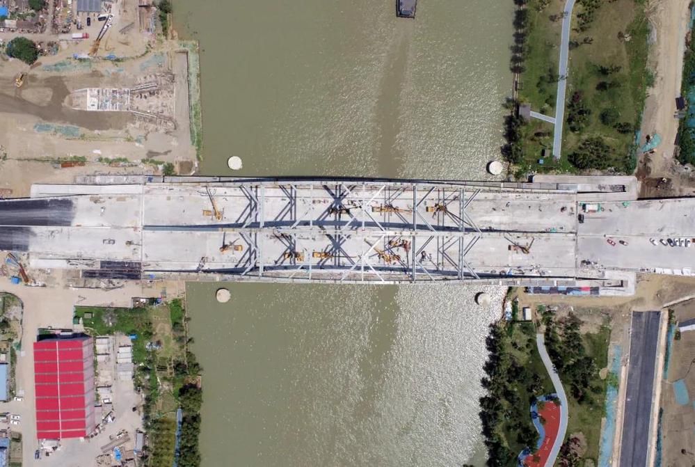 跨京杭運河大橋是萬福快速路工程重難點及控制性節(jié)點工程,施工難度大、精度要求高,決定著整個工程關(guān)門工期。施工過程中涉及的鋼棧橋施工、深基坑施工及上部結(jié)構(gòu)吊裝均為超過一定規(guī)模的危險性較大的分部分項工程,施工安全風(fēng)險高。為確保按期完成,錢俊多次組織召開專題推進會,倒排工期,掛圖作戰(zhàn),制定詳細的施工計劃,出現(xiàn)偏差及時分析并修正調(diào)整;同時,加強與海事、航道、船閘等部門的對接協(xié)調(diào),確保鋼構(gòu)件及時進場、及時封航吊裝。施工期間,每天安排專人對施工部位進行巡查,檢查措施落實情況,針對發(fā)現(xiàn)的問題及時組織各方商討最佳解決方案,優(yōu)化施工工藝。在全體參建人員的共同努力下,2021年1月27日,跨京杭運河大橋拱肋全部合龍;2021年4月16日,跨京杭運河大橋橋面板合攏......目前,萬??焖俾饭こ陶凑占榷ㄓ媱濏樌七M,工程形象進度完成率近90%。