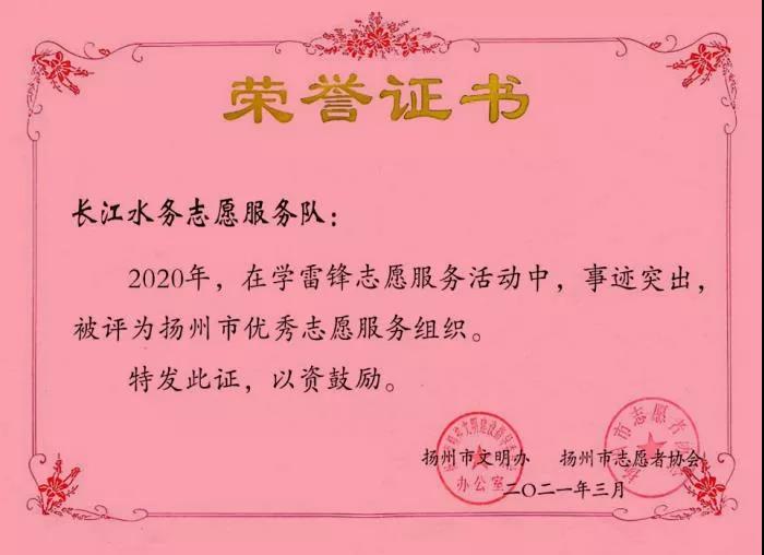 近日,2020年度揚(yáng)州市志愿服務(wù)評(píng)優(yōu)創(chuàng)先推薦活動(dòng)結(jié)果揭曉,長(zhǎng)江水務(wù)公司榮獲“揚(yáng)州市優(yōu)秀志愿服務(wù)組織”榮譽(yù)稱號(hào)。