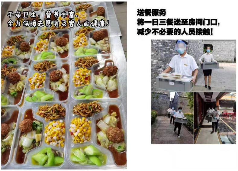 嚴控食品安全管理不越紅線。嚴格把控食品安全關(guān),建議供貨商進行無接觸配送,每日及時清理過期變質(zhì)原料和食品;客人餐食合理搭配,營養(yǎng)均衡,每日將三餐送至客房區(qū)域,由客人自取,用餐完畢由服務人員取走餐具進行清洗、消毒,垃圾統(tǒng)一回收處理。