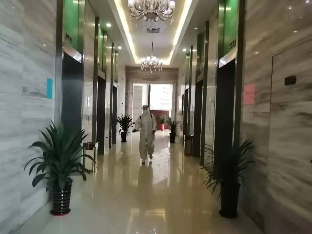 除了大廈日常運(yùn)行和進(jìn)出管控工作外,為進(jìn)一步減少人員流動(dòng),防疫的另一項(xiàng)重要工作——消殺,也由項(xiàng)目駐守人員接替保潔來完成。他們通過電話和視頻向保潔人員詳細(xì)學(xué)習(xí)了消毒的方法,消毒工具如何操作,哪里需要大面積噴灑,哪里需要用消毒液擦拭……兩名工作人員在做好日常巡查、維護(hù)的同時(shí),每天2次對(duì)國泰大廈大廳、電梯廳、轎廂和有人員進(jìn)出的樓層進(jìn)行消毒,門把手、垃圾箱、扶手、按鍵也都不會(huì)被遺漏。