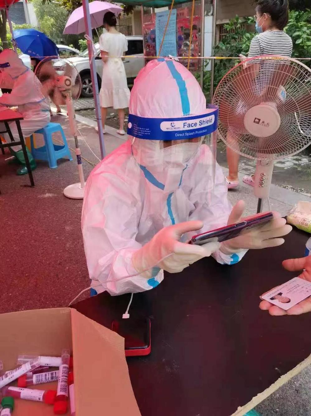 “女兒,我雖然已經(jīng)五十幾歲了,但是我還能出一份力的!”穿上紅馬甲的葛德林很自信?!鞍职?,一位年過半百的人都能有這么高的覺悟,作為年輕人的我也不能掉隊(duì)呀!”葛愛婷下定決心要做好志愿服務(wù)工作,葛愛婷是供水服務(wù)大廳的收費(fèi)員,平時與數(shù)字?jǐn)?shù)據(jù)打交道比較多,于是她成了核酸檢測數(shù)據(jù)信息采錄人員。她把年紀(jì)尚小的兩個小孩都丟給家人照顧,在經(jīng)過疫情防控知識培訓(xùn)后,每天穿上密不透風(fēng)的防護(hù)服,戴上防護(hù)面罩和手套,成了一名“大白”,負(fù)責(zé)核酸檢測人員信息采樣登記。驗(yàn)碼、掃描、錄入數(shù)據(jù)……每次核酸檢測時,這樣的勞動數(shù)以萬次,每次她都一絲不茍,深怕出現(xiàn)差錯,影響檢測結(jié)果。每天工作十幾個小時,經(jīng)歷高溫酷暑,渾身濕透毫無怨言。