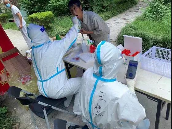 增加了一組檢測臺,檢測進度果然加快了很多,11:30,當天現(xiàn)場的核酸檢測工作就全部結(jié)束了。完成現(xiàn)場工作后,韓棟也不更換防護服,不喝點水補充流失的水分了,一鼓作氣,陪同一名醫(yī)護人員,前往各樓棟為行動不便的老人進行了采樣。