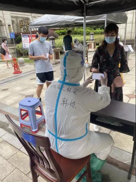 “我來吧!”壯壯的韓棟走上前一步,“我主要是負責(zé)小區(qū)里行動不便的老人,我去支援登記工作,到時候我們就先完成現(xiàn)場工作,最后上門幫幾位老年人做吧?!甭犃隧n棟的建議,大家紛紛贊同。事不宜遲,登記人員立刻為韓棟做了崗前培訓(xùn),掃描身份證和試管條碼的方法、角度,只有身份證照片的如何操作?只有身份證號的如何操作?掌握了知識要領(lǐng)的韓棟立即穿上防護服化身“韓大白”,正式成為了當天核酸檢測的登記人員。