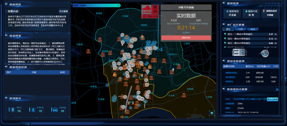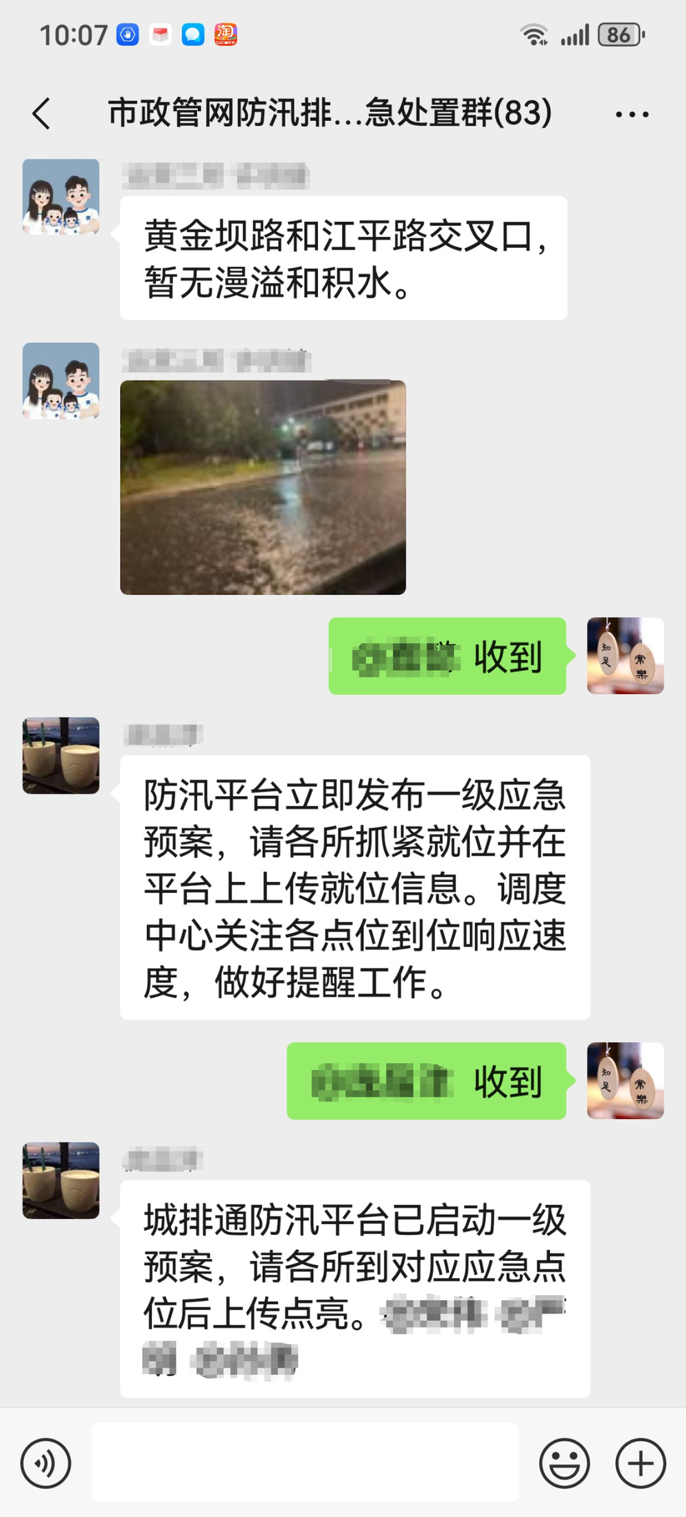 6月6日開始,各相關部門已根據(jù)天氣預警按照統(tǒng)一部署和既定安排開展污水設施加密巡查,部署好應急人員、物資隨時待命。6月7日凌晨3時23分氣象部門發(fā)布暴雨藍色預警后,公司立即通過“城排通”系統(tǒng)啟動應急預案,快速落實污水設施、雨水排口、易積水點和在建工程現(xiàn)場的巡查和應急處置工作。由于突降暴雨,市區(qū)部分道路很快出現(xiàn)積水,且涉及多個高考考點周邊,情況十分緊急,與此同時氣象部門緊急升級發(fā)布暴雨黃色預警。為及時做好處置,公司第一時間調(diào)整了應急響應等級,通過“城排通”系統(tǒng)實時監(jiān)測運行數(shù)據(jù),加強信息共享和部門間應急聯(lián)動,適時調(diào)整運行調(diào)控策略,對發(fā)現(xiàn)的路面積水險情,迅速指揮、調(diào)度搶險班組和物資開展應急排澇。