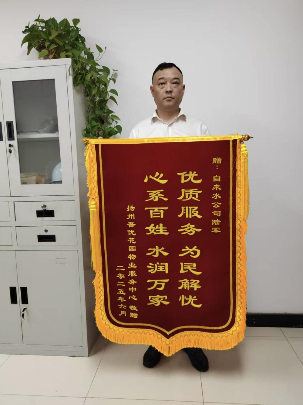 2025年6月13日下午,長江水務營業(yè)所稽查科迎來一位特殊訪客——吾優(yōu)花園小區(qū)物業(yè)人員。他們?yōu)榛榭瓢嚅L陸軍送來錦旗,致謝其心系用戶、為民解憂的實干精神。