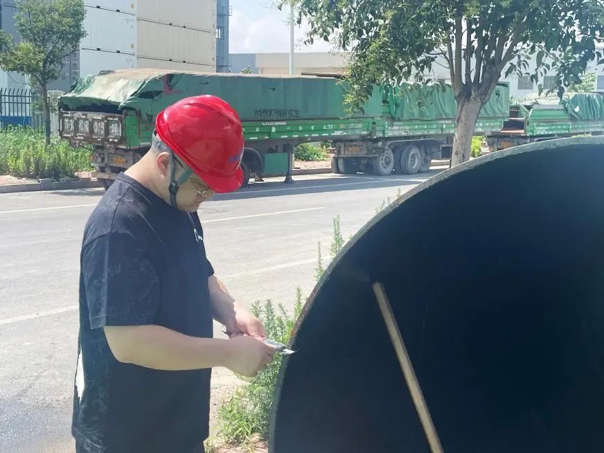惡劣天氣,尤其是陰雨連綿,是對材料驗(yàn)收更嚴(yán)峻的考驗(yàn)。為防止水穩(wěn)和基層被雨水浸濕,顧濤一邊要求工人加快攤鋪速度,一邊俯身檢查水穩(wěn)層是否有松散跡象。雨水濕衣,泥濘滿褲,他仍堅(jiān)持在泥水里仔細(xì)核對,檢查到場管材是否存在裂縫、破損。無論是深夜的困倦,還是惡劣的環(huán)境,都無法動(dòng)搖他堅(jiān)守的責(zé)任心,他用日復(fù)一日的“零容忍”的嚴(yán)謹(jǐn)態(tài)度、“隨時(shí)待命”的敬業(yè)精神,守護(hù)著每一批材料的品質(zhì),為市政道路建設(shè)的雨污水暢通和景觀煥新筑牢根基。