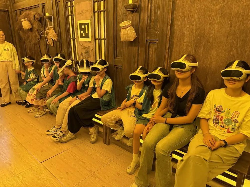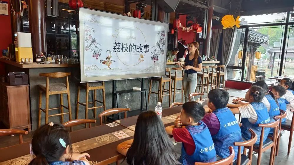 孩子們在老師的帶領(lǐng)下走進淮揚菜博物館,從古籍記載的飲食習(xí)俗,到非遺傳承人的技藝展示,大家一邊觀察飲食文物,一邊聆聽講解,在互動中了解到淮揚菜與古代飲食文化的深厚關(guān)聯(lián)。緊隨其后的唐朝詭事錄VR劇場成為活動高潮,孩子們戴上VR眼鏡,瞬間“穿越”至盛唐街頭,化身“小偵探”跟隨劇情線索探尋關(guān)于荔枝的謎題。虛實交織的場景、生動有趣的互動,讓抽象的歷史故事變得可感可觸?;顒游猜?,孩子們圍坐一堂開啟“荔枝課堂”,老師從杜牧“一騎紅塵妃子笑”的詩句切入,講解荔枝的歷史典故、生長特性與文化寓意,讓孩子們在詩詞與美食的碰撞中深化認(rèn)知。最后,孩子們親手將新鮮荔枝制成清甜飲品,在動手過程中體會“勞動創(chuàng)造美味”的樂趣。