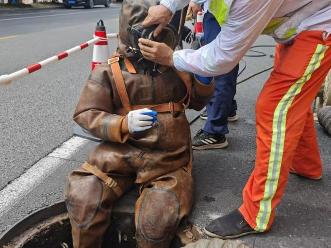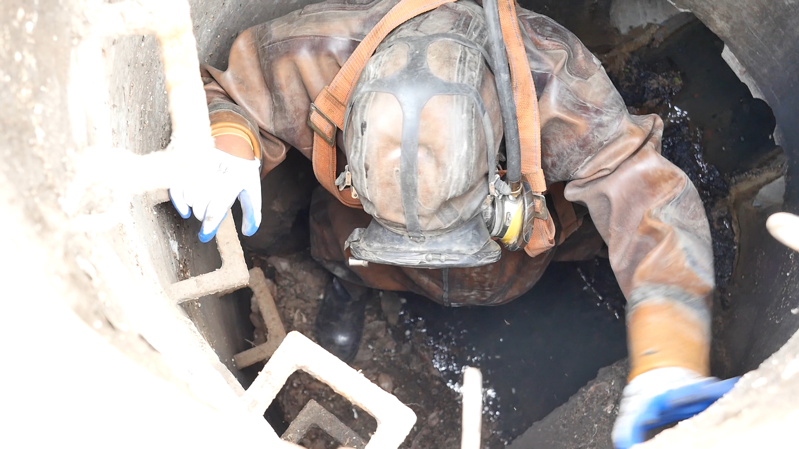 對于井室和管道內(nèi)存在的大塊水泥和混凝土,常規(guī)方法難以清除,只能通過人工下井清掏。穿上厚重的防護服、戴上防毒面具、系好安全繩,相榮慢慢降入井中。管道內(nèi)悶熱潮濕、空氣混濁。“井下溫度比地面還高,像蒸桑拿?!痹谥睆絻H700mm的井室內(nèi),相榮用風(fēng)鎬將水泥塊打碎,并用小桶將打碎的水泥碎塊裝進去,再由井上面的輔助人員一桶一桶的拎上來,并及時裝入垃圾袋,當(dāng)天集中清運。經(jīng)過兩個小時的奮戰(zhàn),他們終于疏通了這段兩米多長的堵塞管道。當(dāng)相榮被上面兩個輔助人員通過三腳架及安全繩拉上來時,汗水濕透了他的衣服。