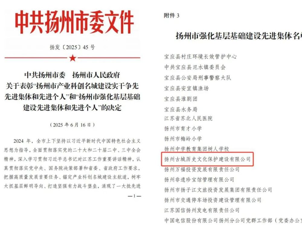 近日,揚州市委、市政府印發(fā)《關(guān)于表彰“揚州市產(chǎn)業(yè)科創(chuàng)名城建設(shè)實干爭先先進集體和先進個人”和“揚州市強化基層基礎(chǔ)建設(shè)先進集體和先進個人”的決定》。揚州古城歷史文化保護建設(shè)有限公司(以下簡稱“古保公司”)獲評“揚州市強化基層基礎(chǔ)建設(shè)先進集體”。