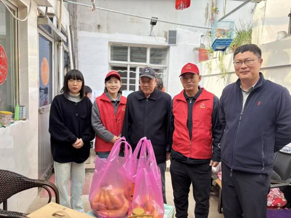 活動中,志愿者們來到兩戶老年人家中,將寓意“步步高升、健康長壽”的重陽糕和米、油、牛奶等慰問品遞到老人手中,與老人們促膝交談,詳細(xì)詢問飲食起居與健康狀況,一句句暖心問候、一聲聲真誠祝福,讓老人家中充滿歡聲笑語。
