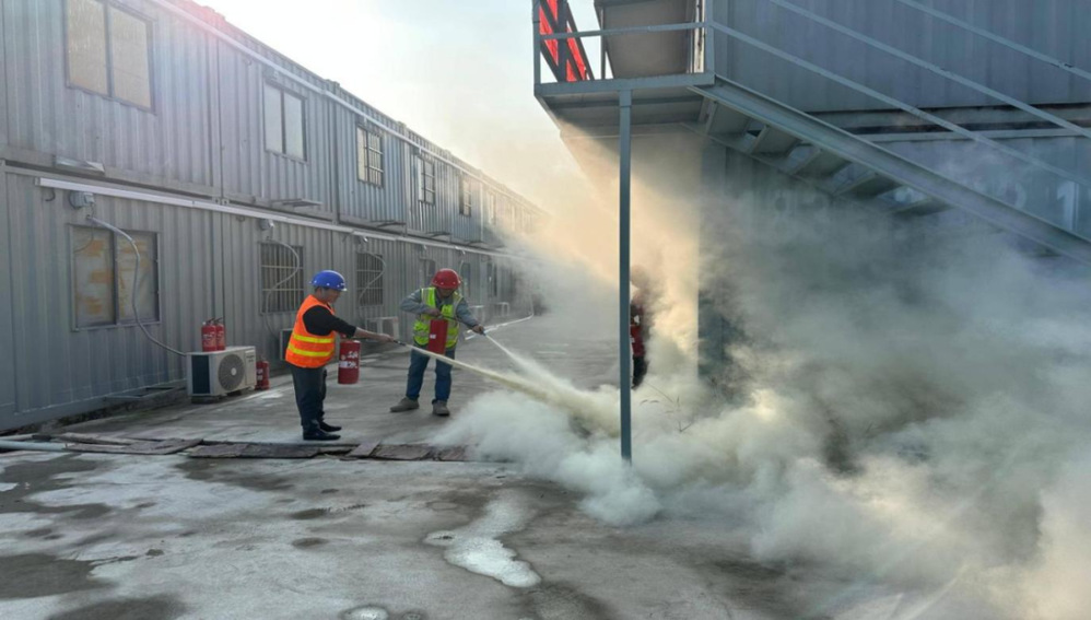 本次培訓(xùn)邀請(qǐng)消防安全專(zhuān)家進(jìn)行授課。演練前,專(zhuān)家詳細(xì)講解了火災(zāi)報(bào)警流程、初期火災(zāi)撲救技巧、疏散逃生注意事項(xiàng)等核心知識(shí),重點(diǎn)演示了滅火器“提、拔、握、壓”的正確操作方法,同時(shí)明確了疏散引導(dǎo)員、滅火行動(dòng)組的職責(zé)分工,劃定了安全疏散路線(xiàn)和集合區(qū)域。下午2時(shí)30分,演練正式啟動(dòng)。模擬火情信號(hào)發(fā)出后,集裝箱板房?jī)?nèi)煙霧彌漫,現(xiàn)場(chǎng)立即啟動(dòng)應(yīng)急響應(yīng)預(yù)案。疏散引導(dǎo)員迅速組織員工用濕毛巾捂住口鼻,彎腰低姿沿預(yù)定路線(xiàn)快速、有序撤離至指定安全區(qū)域;滅火行動(dòng)組攜帶滅火器、消防水帶等器材,第一時(shí)間趕赴“火情”現(xiàn)場(chǎng),對(duì)著火點(diǎn)實(shí)施精準(zhǔn)撲救。