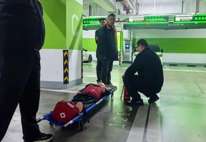 本次演習(xí)模擬地下車庫(kù)充電樁線路因短路引發(fā)起火、濃煙蔓延的險(xiǎn)情。煙感報(bào)警觸發(fā)后,商場(chǎng)立即啟動(dòng)充電樁火災(zāi)應(yīng)急預(yù)案,各專項(xiàng)小組嚴(yán)格按照預(yù)案要求高效聯(lián)動(dòng):警戒組快速劃定警戒區(qū)域;通訊組精準(zhǔn)通知車庫(kù)內(nèi)車主緊急移車;疏散組引導(dǎo)商戶及工作人員沿指示標(biāo)識(shí)撤離;滅火組穿戴專業(yè)防護(hù)裝備,嚴(yán)格遵循“斷電優(yōu)先、精準(zhǔn)撲救”的處置原則,成功撲滅模擬火情。