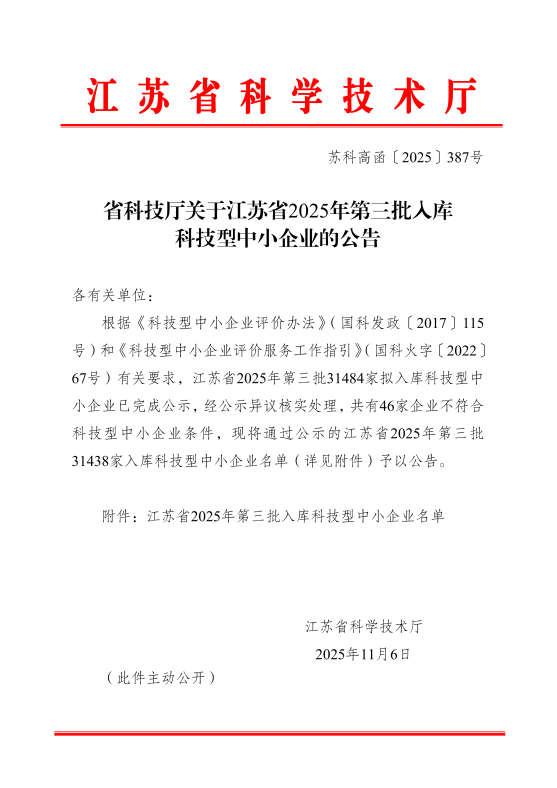 近日,江蘇省科學(xué)技術(shù)廳公布了江蘇省2025年第三批入庫科技型中小企業(yè)名單,揚(yáng)州市政管網(wǎng)有限公司下屬子公司江蘇城安管網(wǎng)技術(shù)有限公司憑借突出的技術(shù)創(chuàng)新能力與發(fā)展?jié)摿Τ晒θ霂臁?/span>