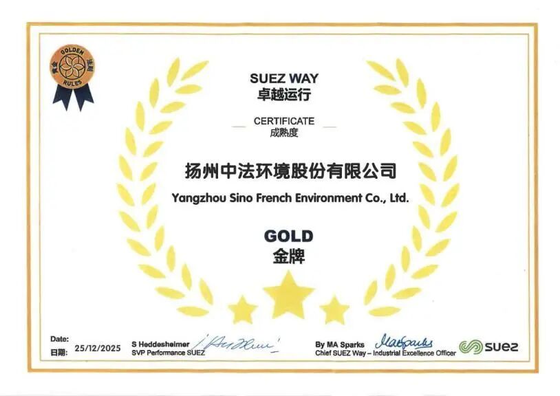 12月25日,蘇伊士集團正式授予揚州中法環(huán)境股份有限公司“SUEZ WAY卓越運行成熟度金牌”。這一榮譽不僅標(biāo)志著企業(yè)管理水平達到蘇伊士集團全球最高標(biāo)準(zhǔn),更成為蘇中地區(qū)首個獲此認(rèn)證的環(huán)保企業(yè),為中國污泥處置領(lǐng)域的國際化發(fā)展提供了示范范例。