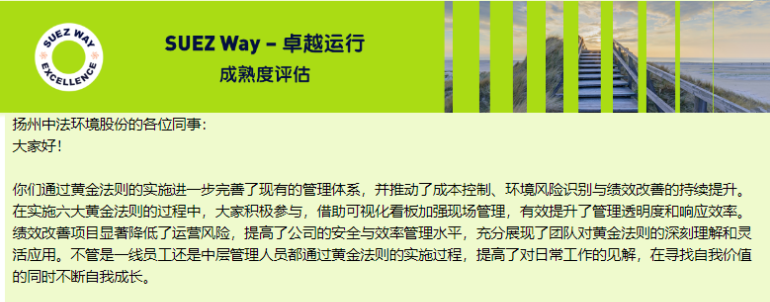 今年是SUEZ WAY在中國推行的第4年,揚州中法環(huán)境也成為了蘇伊士中國地區(qū)46家企業(yè)中第4家獲此“金牌”認(rèn)證的企業(yè)。揚州中法環(huán)境將以金牌認(rèn)證為新起點,繼續(xù)堅持“走出去”的開放思路,借助SUEZ WAY審核契機,豐富和完善現(xiàn)有管理體系。