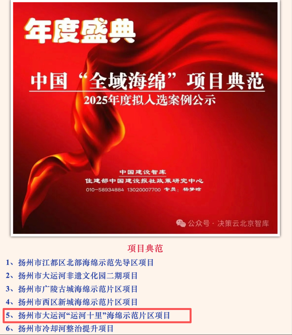 近日,由中國(guó)建設(shè)報(bào)主辦的2025年度“中國(guó)海綿城市典范”“中國(guó)‘全域海綿’項(xiàng)目典范”入選名單正式發(fā)布,“運(yùn)河十里”項(xiàng)目示范段成功入選。